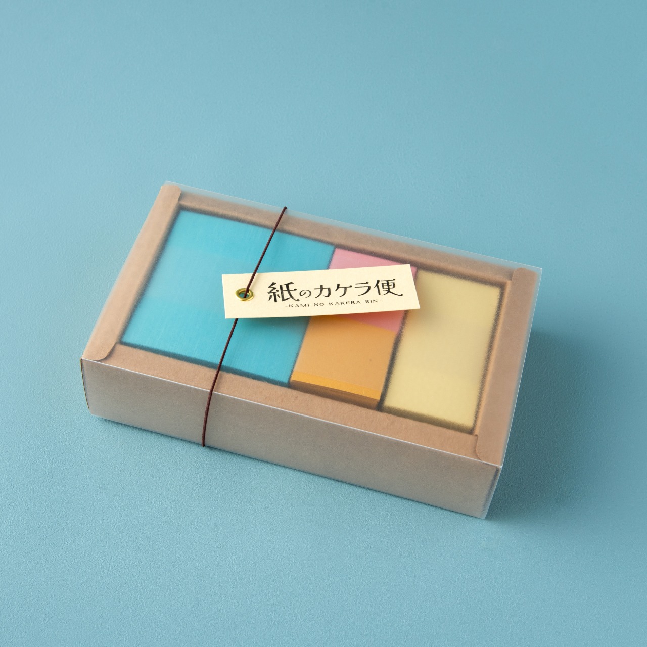 本来なら捨てられてしまう、印刷の過程で生まれた端材をいろいろなサイズにカットして、ぎゅっと詰め合わせました。